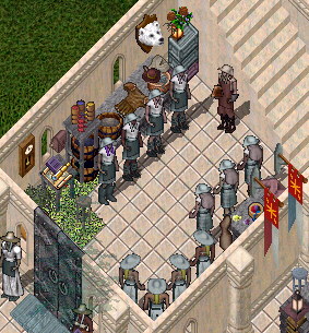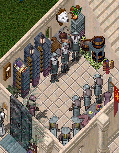 ちょっと2階のテラスにクリスマスツリー飾ってたので、影ができちゃってますが。かばんの中にトレハンルーン本全て入ってます。本には、その説明など。ベンダーが二人増やせたよ♪ちなみに、ワイドブリムハットの店員ちゃんたちが、お洋服ベンダーで、丸いフラッピーハットの店員ちゃんは家具・石細工ベンダーです。室内は、インテリアと、お洋服でまとめることができてて嬉しい。試着室作りたいなー。でもまだまだ、満足ではないですなー。まだちょっとすかすかーって感じかなあ?1階でギルドメンバーやお客さまが話しこんだりすることもあるので、窮屈にはしたくないし、バランスむずかしい。人が何人かお買い物したり話したりしてると、わりとこの余白が良い感じだったりします。 ちなみに下の画像は上の二つ以前に作った失敗内装。日記の日付をみると10月19日となってます。テラスにいた裁縫ベンダーを室内にもってきて、憧れのお洋服やさんの内装ができるぞーと勇み足に一番最初に作った形なのです。カウンター式(手前と奥で、区切るというのかな?)にしてみたくて、やったの。だけどこれがまた、うちのギルド(店)のスタッフに見づらいetcと評判悪くて!!1日で改装しました。すげーー時間だけはかけたんですけど。今見るとだめだこりゃって感じ。店員が立ったり座ったりしてるのも見栄えが良くないしね(こりは、後ろのテーブルのアイテムを浮かしたりして自然に見えるようにしていたのでベンダーが立ってるとかぶったりして、苦肉の策だったのです。今は石テーブルもあるし、今やったらまた違った感じになるでしょうね)