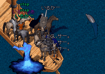 | みんなでお金を3000ずつ出しあってお船を買いました。いるかに会えたら良いな。 途中なーんにも無い島にたちよってうろうろしてみたり。ほんとに何もなかった。海はモンスターもでなくて結構安全だった。でも、街に近い所にはシーサーペントやウォーターエレメンタルなどけっこういっぱい叩けて楽しい。 そしてそして、鳴き声が!いるか発見!!
