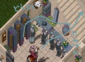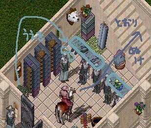 当初はベンダーの位置がこうなっていて、ごまかし布をいっさい使わず、テーブルを真ん中2人の後ろの隙間を開ける感じで、配置していたのです。ベンダーは横一列に並んでいて、本だなの右には従来通りの植木。スタッフやメンバーだけが机のすきまを通ってバックヤードに行くという感じ!テーブルの上に乗ったアイテムも良いバランスでいい感じだったんだけど、重大な事に気づいたのでした!!!それは、ペットが人を通りぬけられないので通れないということです(><)!!2階作業場だから、堀にでかけたときの荷馬が通れないと困る(TT)テラスに、フォージとアンビル置こうかとかいろいろ考えたけど、やっぱり、荷馬やペットが通れなくて不便になるのは屋上に皆で集まるしギルドハウスとしてちょっと納得できないかもと思い考えなおしました。