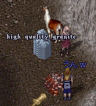 2日ぶりにUOしてたら新しい生産ができてたよ!石細工とガラス細工。石細工は大工スキル、ガラス細工はアルケミスキルが必要とのこと。そして、材料となる岩と砂をとるには掘りスキルGMが必要なんだって。大工と掘りがGMだから石細工はできるぅ。