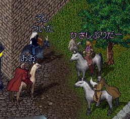 らぶらぶかっぷるー。SBC内で社内恋愛1組社外恋愛1組誕生したっぽいぽい。いままでそう言う話全然なかったねえ。そんなわけでその人達はブリタニアらぶらぶデートなのでギルドの集まりにはいません!!らぶらぶかっぷるにらぶらぶお洋服セット作って売りつけてやらねば。いやでも、恋人たちに服はいらないわ。これから脱ぐってのに。 そしたら今日は!なんと、私、Sakonさん、ともさん、ピエールの初期メンバーだけが揃ったんです。うーんこのメンバーってアダルティーよね!なんちって。 そしたらSakonさんが久々にブリ魔法屋横にゲートを出してくれました。懐かしの、思い出の場所。