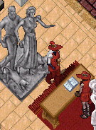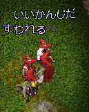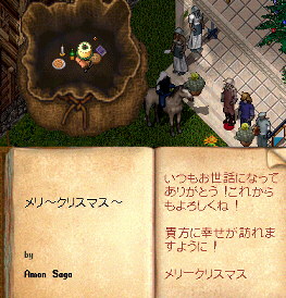 建物の木陰でしばらくお話お話。すっかり良いムードなところへ、らぶらぶデートがえりのはむさんがそらに戻って来たとの事。合流して今度は、3人で、歩いてらいきゅーむから望遠鏡へ。もちろん、はむさんにもサンタさんになってもらいます。ずっとずっとむんぐろの道の上を歩いて望遠鏡まで行きました。凄く楽しかった。道の上を歩く事がこんなに楽しいなんて、あるていどUOをやって、リコールとか使いまくりの人ならみんなそう思うね。
