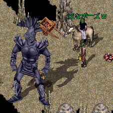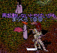 私もあんまりイルシェナーみんなについていってるだけで、知らなかったなーと思って二人でイルシェナー探索。このあいだ、中華ドラみにいったし、あれはみておくといいかも!!と思って中華ドラのところへ、ようようでいきました。 じゅかのいるところで、死にまして・・・。扇動きかなかったのね・・・。ロード強いっっ。いつも戦士だったからきづかなかったよっっ。そんで、一本道を間違えて、行き止まりの建物にはいってしまい二人とも死にました。なんかモンスターににじり寄られるなんて、映画みたい。死んだけどっっ。まぁこれで気軽に幽霊見物!!はりぃさんはUOAでカラーで見えるらしいし、のーぷれぶれむですねい。