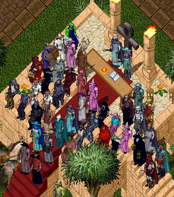 式の最後に記念写真を撮りました(^^)顔にお花のモザイクがかかった方が!!!そしてこの後は、プレイヤーが経営する酒場、椅子椅子亭さんのうらで2次会がおこなわれるというので、行きました!ちゃんと、テーブルとか会場が設置されてたああ。そこで、HappyWedding銘の!!ケーキ入刀、みんなでかんぱーいして、食べ物をたべまくっていろいろな人とお話して、さおりさんやつばめさんとも挨拶できたし、ほんとに楽しかったです!二人とも末永くお幸せにね!楽しい時間をありがとう(^−^♪ |