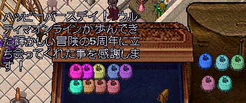 今日またイベントが第何週とかそんなかんじで新しいのはじまるのよねええー。それと、長期褒賞がまたいろいろ追加されたり、UO5周年のケーキがログインしたらかばんにはいっていたりといろいろまた導入されましたなー。うー覚えるの大変。