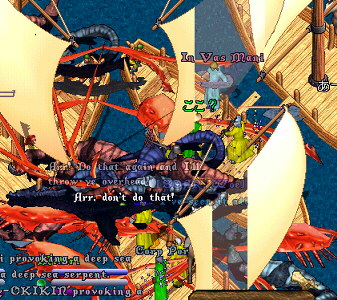 こんなかんじで船がいっぱいー!待機だったので、みえるとこまでちょといってみたら、おーるねーむでモンスターの名前がいっぱい!!パーティめっせで、わけわからないーとか、重いとかきこえるう。きっとすさまじくなってるのでしょう。地図とったーとか、しんじゃったとか、みんながんばってたああ。途中で戦利品をいれにきたり。 そして、しばらくして、さこんさんが戻ってきてかわろうというので、かわってもらいました。あーこわいなあ。私扇動あるけどへぼへぼだし、なにもできないんじゃなかろうか・・・とおもっていったら・・・。