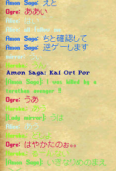 夜はさこんさんのネクロべんだーのふるすぺ本が売れてたから、ネクロスクロールほしいねえって話になって、黒閣下狩りに行きました。蜘蛛城地下へ。人がいたら、いるしぇなーのカオスのほう行こうって話しもでて、さこんさんが、一足先に蜘蛛城地下へ様子をみにいったんだけど・・・・。そのときすでにみんなで、パーティを組んでいて、↓がそのときのログ。